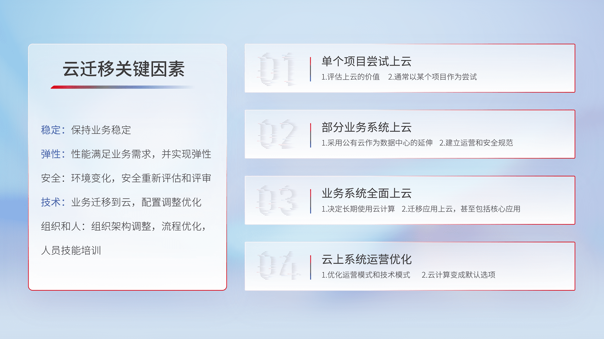 结合实际业务,,从规划设计、、、云平台选型、、云原生改造、、数据迁移、、集成交付,,,迁移全过程为客户识别最佳上云路径,,,做好风险识别管理,,,,设计网络架构、、、身份权限、、、安全审计合规、、、操作审计、、、日志审计、、、、监控告警策略、、、、多站点容灾设计等,,,,对云上基础设施进行整体规划,,,,提升IT治理水平,,以满足弹性、、、高可用、、、高性能的需求。。。